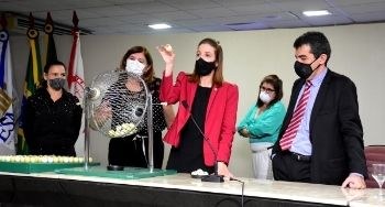 #PraTodosVerem Foto registrada no auditório da Esmec, no momento do sorteio da distribuição do tempo do Horário Eleitoral Gratuito das Eleições 2020, em Fortaleza. Na imagem, sobre uma bancada, globo giratório com números para sorteio. Atrás da bancada, ao centro, a coordenadora da Comissão da Propaganda Eleitoral e do Poder de Polícia em Fortaleza, juíza Mirian Randal; à sua esquerda, o juiz auxiliar da Corregedoria Regional Eleitoral do Ceará, Rommel Conrado; e, à sua direita, as servidoras do Tribunal Cilene Muniz (SJU) e Mirna Chrispim (ASCOM). Atrás da juíza, a promotora da 93ª Zona Eleitoral, Lilian Albuquerque. Todos usam máscara. No cenário, no canto esquerdo, 4 mastros com bandeiras.
