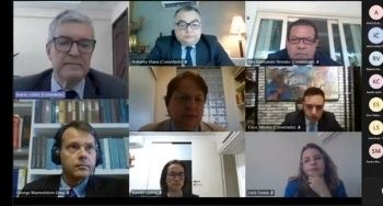 Print da tela da Sessão do Pleno. O print apresenta o mosaico com a imagem de oito membros da Corte. No lado direito, sete círculos coloridos, em uma fileira, representando outros participantes.
