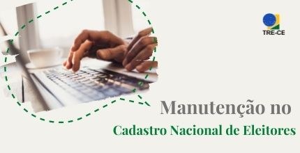 Banner com fundo cinza. À esquerda, sobre um balão de fala pontilhado verde, imagem das mãos de uma pessoa de pele branca que digita no teclado de um notebook cinza. No canto superior direito, logo do TRE-CE. Na parte inferior do banner, Manutenção, cinza; e Cadastro Nacional de Eleitores, verde.