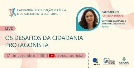 A Escola Judiciária Eleitoral (EJE) do Tribunal Regional Eleitoral do Ceará (TRE-CE), em parceria com a Secretaria de Educação do Estado do Ceará, promoverá, nesta sexta-feira, 17/09, às 10h, a live "Os desafios da cidadania protagonista”. O evento contará com recurso assistivo de intérpretes da Língua Brasileira de Sinais (Libras) e será transmitido, ao vivo, no Canal do Tribunal Regional Eleitoral do Ceará (TRE-CE), no YouTube (/trecearaoficial).