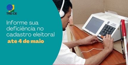 O Tribunal Regional Eleitoral do Ceará (TRE-CE) informa que as pessoas com deficiência ou mobilidade reduzida podem informar sua deficiência até 4 de maio para votar seção com acessibilidade. A informação permite a adoção gradual de medidas de redução de barreiras que impeçam ou dificultem o exercício do voto, ampliando a inclusão dessas pessoas no dia da eleição.
