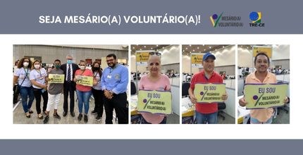 Card de fundo lilás. Na parte superior, a frase: Seja mesário(a) voluntário(a), em letras brancas e caixa alta. Ao lado, as logos do Mesário Voluntário e do TRE. Abaixo, sobre uma tarja branca, sequência de quatro fotos, lado a lado. A primeira foto mostra o desembargador Inacio Cortez ao lado de servidores do Tribunal e de um homem e uma mulher que seguram cartazes. Os banners são amarelos e têm a mensagem: Eu sou mesário voluntário". A segunda foto mostra uma senhora segurando a placa de mesário. Ela usa blusa rosa e calça jeans, e sobre seus cabelos há um óculos escuro. Na terceira foto, ao lado, um homem usa boné, blusa vermelha e calça jeans. Ele também segura o cartaz. Na quarta foto, à direita, um homem de blusa rosa e calça jeans segura a placa de mesário.