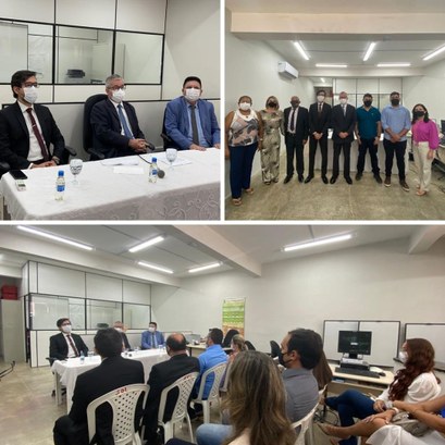 Montagem com três fotos divididas em duas linhas: na primeira da esquerda para a direita, estão sentados à mesa de honra, o juiz eleitoral da 15ª Zona, o presidente do TRE, e o procurador de Icó. A foto é diagonal. Sobre a mesa estão garrafinhas de álcool em gel e taças de vidro. Na segunda imagem, estão de pé perfilados os servidores e as servidoras do cartório, bem como o juiz eleitoral e o presidente do TRE. Abaixo, a terceira foto, registra um momento da solenidade, em que aparecem a plateia e a mesa de honra, sendo o público destacado em primeiro plano, a partir da lateral do local do evento.