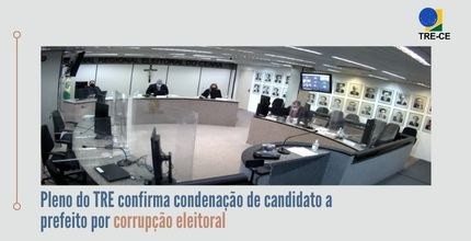 Banner na horizontal de fundo cinza. No canto superior esquerdo, logo do TRE. Abaixo, no lado direito, linha vertical marrom, e no centro, foto da sessão de julgamento. Na foto, sentados atrás da bancada principal, o procurador Edmac Lima Trigueiro, o desembargador Inacio Cortez e a diretora-geral, em exercício, Cecília Arruda. No lado esquerdo da foto, sentado, o juiz David Sombra. Na parte inferior, o texto: Pleno do TRE confirma condenação de candidato a prefeito por corrupção eleitoral, em letras azuis. Corrupção eleitoral está na cor marrom.