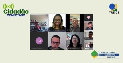 Banner fundo cor de neve. No canto superior esquerdo, a logo do Projeto Cidadão Conectado. Do lado direito, as logos TRE-CE, na parte superior, e da Corregedoria, na inferior. Ao centro, print da tela com as imagens das pessoas que participaram de uma das reuniões virtuais.