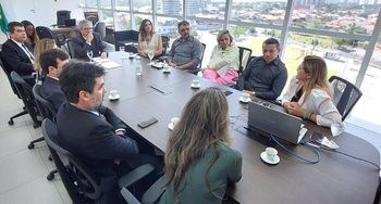 Foto feita no gabinete do presidente do TRE-CE. Ao redor de mesa retangular de madeira, estão os(as) participantes da reunião ocorrida em 27/09/2022. Sobre a mesa está um computador, papéis, copos, xícaras e celulares. Ao fundo da foto, aparece a vista do gabinete, composta por árvores, casas e prédios.