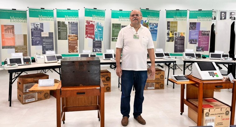 Na primeira foto, Heleno do Vale, da Seção de Arquivo e Gestão Documental (Saged), de blusa branca e calça jeans, posa no espaço do Centro de Memória do Tribunal. No cenário, oito banners que apresentam pontos marcantes da história da Justiça Eleitoral brasileira estão à frente da parede, enquanto, em mesas dispostas na sala, contêm diversas versões das urnas eletrônicas já utilizadas no sistema.