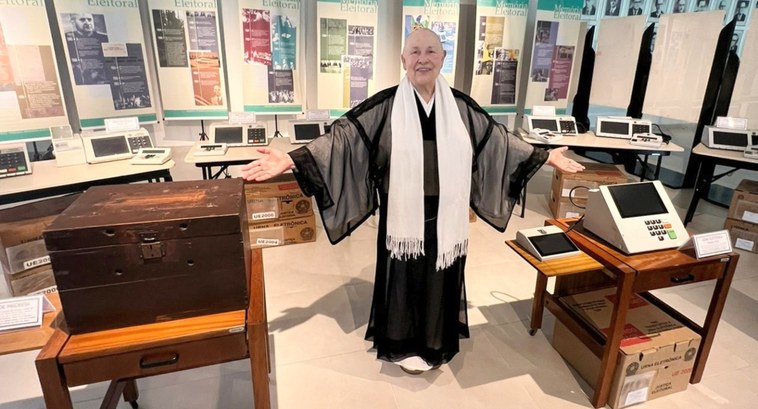 As duas imagens são registros fotográficos. A primeira, realizada no Centro de Memória Eleitoral do TRE-CE, mostra a monja Coen ao centro, em meio aos objetos dispostos no equipamento, como urnas eletrônicas e urna de madeira. Ela usa um manto preto e um cachecol branco sobre os ombros, e está de pé com os braços abertos. Na segunda, feita no auditório da sede do TRE-CE, a juíza auxiliar da Presidência, Bruna Rodrigues, e o diretor-geral Pedro Bruno Trigueiro, estão na lateral direita da imagem. Ambos estão sentados em poltronas pretas. A juíza é uma mulher de pele negra, possui cabelos castanhos com mechas loiras, e usa camisa e calça sociais na cor branca, além de sapatos na cor bege. Já o diretor possui pele branca, e usa blazer cinza-claro, camisa social branca, calça cinza-escuro e sapatos sociais de cor preta. Atrás, estão dois arranjos de flores. Mais ao fundo, está em pé um intérprete de Libras. Ele usa camisa gola polo e calça na cor preta. Na lateral esquerda da foto, está o assessor-chefe da Ascom do TRE-CE, Rodrigo Santiafo. Ele está em pé, atrás de um púlpito, e usa terno azul-escuro com camisa social amarela, além de óculos de grau.