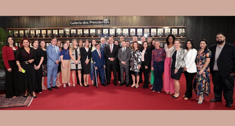 Foto feita no salão nobre do Tribunal Superior Eleitoral. Lado a lado e de pé, estão os(as) representantes das Assessorias de Comunicação dos TREs e do TSE. Entre eles(as), no centro da foto, está o presidente do TSE, ministro Alexandre de Moraes. Ao fundo, aparece parte da galeria de fotos dos presidentes do TSE.