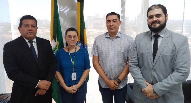 Foto retangular registrada na sala da Presidência do TRE-CE, em Fortaleza. De forma centralizada, da esquerda para a direita, estão: o presidente do TRE-CE, desembargador Raimundo Nonato; a coordenadora técnica da Aprece, Rafaela Saraiva; o assessor jurídico da Aprece, Helder Diniz; e o presidente da Aprece, Francisco de Castro Menezes Junior. Atrás do grupo, há duas bandeiras, uma do Estado do Ceará e outra do Brasil.