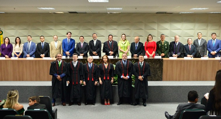 Foto retangular registrada no auditório principal da sede do TRE-CE, em Fortaleza. De forma centralizada, os membros do Pleno posam para a imagem, todos vestidos com toga preta. Da esquerda para a direita: o juiz federal Glêdison Marques Fernandes; o juiz de Direito Raimundo Deusdeth Rodrigues Júnior; o vice-presidente do TRE-CE, Francisco Gladyson Pontes; a jurista Kamile Moreira Castro; o juiz de Direito Roberto Soares Bulcão Coutinho; e o jurista Érico Carvalho. Atrás do grupo, estão autoridades dos Poderes Executivo, Legislativo e Judiciário, como o presidente do TRE-CE, o desembargador Raimundo Nonato Silva Santos, o governador Elmano de Freitas; a vice-governadora Jade Romero, além dos senadores Cid Gomes e Augusta Brito, entre outros.