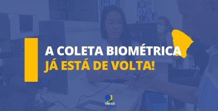 Banner na horizontal de fundo azul. Ao centro, o texto: A coleta biométrica já está de volta. A expressão: A coleta biométrica, está na cor branca, e a expressão: já está de volta, está na cor amarela. Do lado direito, mapa do Ceará amarelo. Do lado esquerdo, retângulo vertical amarelo. Ao fundo, foto de colaboradora sentada atrás de uma mesa. Ela coleta a biometria do eleitor sentado ao lado da mesa.