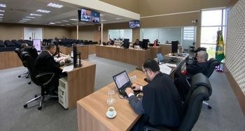 Foto do pleno do TRE-CE. Foto tirada ao lado da bancada principal do pleno. No lado direito, está a bancada principal de madeira. Atrás dela, o desembargador Inacio Cortez e o diretor-geral Hugo Pereira estão sentados lado a lado. Do lado esquerdo, duas bancadas: uma de frente para a outra. Atrás delas, magistrados da Corte estão sentados. Após, plateia com cadeiras pretas.