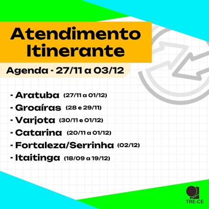 Card quadrado com fundo quadriculado branco. Nas partes superior e inferior do card, detalhes triangulares em verde e azul. No centro, sobre uma tarja amarela, em preto, o título: atendimento itinerante. Mais abaixo, sobre uma tarja amarela mais clara, o subtítulo: Agenda - 27/11 a 03/12. Após, ao centro, as informações: Aratuba (27/11 a 01/12) | Groaíras (28 e 29/11) | Varjota (30/11 e 01/12) | Catarina (20/11 a 01/12) | Fortaleza/Serrinha (02/12) | Itaitinga (18/09 a 19/12). Depois, no canto inferior direito, na cor preta, a logo do TRE-CE.