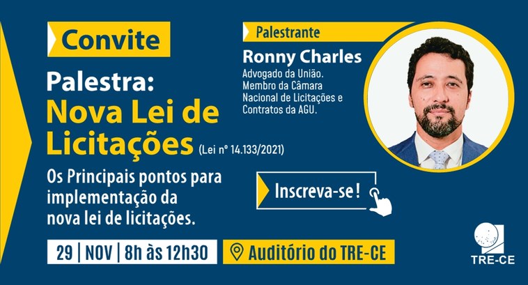 O Tribunal Regional Eleitoral do Ceará (TRE-CE), realizará, dia 29 de novembro, às 8h, palestra sobre a nova Lei das Licitações (Lei nº14.133/2021). A formação será ministrada pelo advogado da União e membro da Câmara Nacional de Licitações e Contratos da Advocacia-Geral da União (AGU), Ronny Charles. As inscrições estão abertas até esta terça-feira (28), através do formulário on-line.