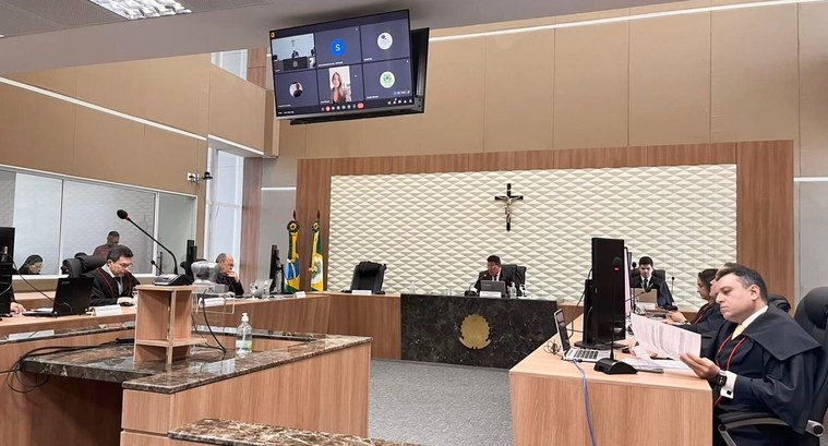 A imagem retangular é um registro fotográfico. O cenário é o Pleno do TRE-CE, que contém bancadas e paredes em cores amadeiradas, uma televisão fixada no teto, bandeiras do Brasil e do Ceará, além do brasão do Tribunal em um fundo de mármore escuro na bancada central. Na cena, existem seis pessoas dispostas em cadeiras, vestindo togas pretas, sendo eles cinco membros do Pleno e o diretor-geral do TRE.