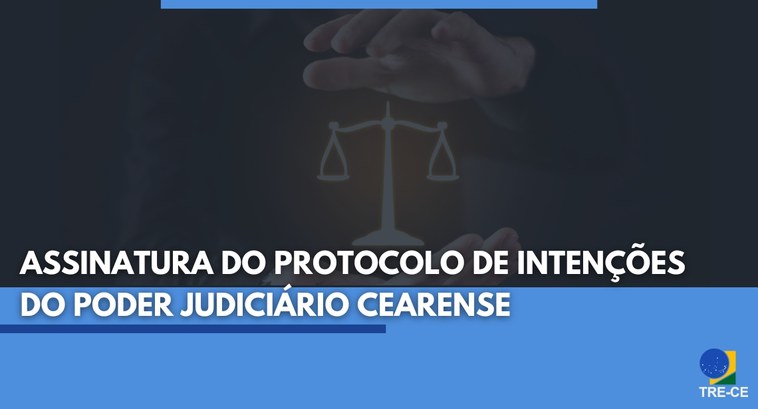 Card colorido na retangular. Ao centro, uma balança com duas mãos ao redor. Logo abaixo, uma faixa azul com a seguinte frase: ASSINATURA DO PROTOCOLO DE INTENÇÕES DO PODER JUDICIÁRIO CEARENSE. No canto direito da faixa azul, a logo do TRE-CE.