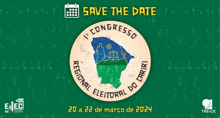 Banner colorido de fundo verde. Acima, do lado direito, uma ilustração de calendário e ao lado, a frase: Save the date. Ao centro, dentro de uma figura circular, tem uma ilustração de um mapa com a frase ao redor: 1° Congresso Regional Eleitoral do Cariri. Logo abaixo, a data do evento, que será nos dias 20 a 22 de março de 2024. Por fim, as logos da EJEC e do TRE-CE em branco.