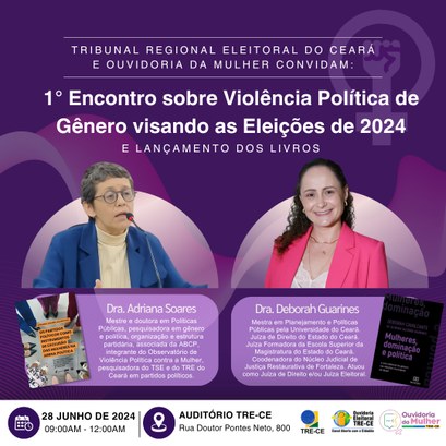 Card colorido no fundo lilás. Acima, o texto: Tribunal Regional Eleitoral do Ceará e Ouvidoria da Mulher Convidam: 1ª Encontro sobre Violência Política de Gênero visando as Eleições de 2024, e lançamento dos livros. No centro, ao lado direito, a foto da palestrante e abaixo, um texto com suas qualificações: Dra. Adriana Soares, Mestre e doutora em Políticas Públicas, pesquisadora em gênero e política, organização e estrutura partidária, associada da ABCP, integrante de Observalôrio de Violência Política contra a Mulher, Pesquisadora do TSE e do TRE do Ceará em partidos políticos. Ao lado direito, mas uma palestrante e abaixo o texto com suas qualificações: Dra. Deborah Guarines, mestre em Planejamento e Políticas Públicas pela Universidade do Ceará. Juíza de Direito do Estado do Ceará. Juíza Formadora da Escola Superior da Magistratura do Estado do Ceará. Coordenadora do Núcleo Judicial de Justiça Restaurativa de Fortaleza. Atuou como juiza de Direito e/ou Juíza Eleitoral. Na parte inferior, na cor lilás, uma figura de calendário, ao lado, o texto: 28 de junho de 2024, 09:00AM - 12:00AM. Ao lado, a figura de localização, ao lado o texto: Auditório TRE-CE, Rua Doutor Pontes Neto, 800. Ao lado, as logos do TRE-CE, Ouvidoria Eleitoral do Ceará e Ouvidoria da Mulher.