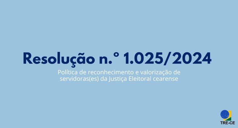 Card retangular de fundo azul. Ao centro, os textos: "Resolução n.º 1.025/2024 | Política de reconhecimento e valorização de servidoras(es) da Justiça Eleitoral cearense". Por fim, a logo do TRE-CE.