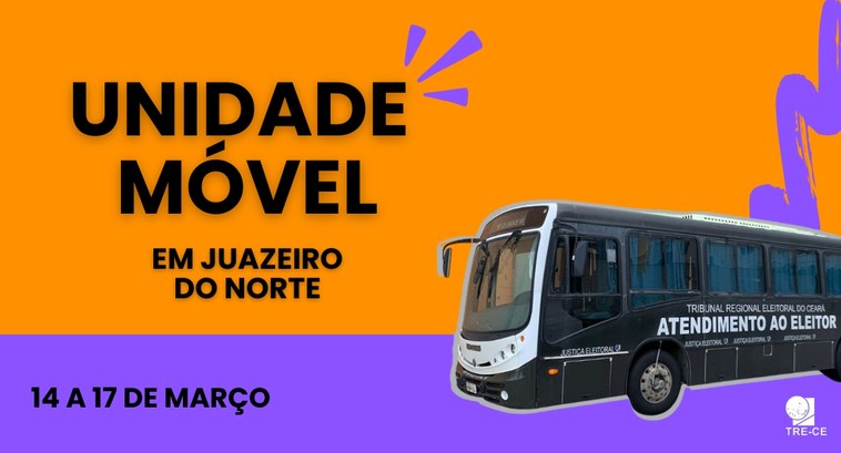 Banner com fundo laranja. Na parte superior da imagem, em caixa alta, na cor preta, está a frase: Unidade Móvel em Juazeiro do Norte. Abaixo do texto, está uma fotografia da Unidade Móvel do TRE-CE. O veículo é na cor preta. Na lateral, possui em caixa alta, na cor branca, a frase: Tribunal Regional Eleitoral, Atendimento ao Eleitor. Abaixo do texto, alinhado em toda a lataria, em tamanho menor e na cor branca, as palavras: Justiça Eleitoral, seguida de sua logo. Ao lado do ônibus, no lado direito da imagem, estão as informações: 14 a 17 de março. No lado direito inferior da imagem, na cor branca, está a logo do TRE-CE.