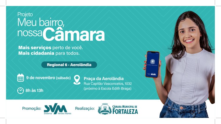 Card gráfico de fundo verde e branco, com detalhes de linhas diagonais. Nele, há os textos, em branco: "Projeto Meu Bairro, Nossa Câmara | Mais serviços perto de você. Mais cidadania para todos. | Regional 6 - Aerolândia | 9 de novembro (sábado) - 8h às 13h - Praça da Aerolândia (Rua Capitão Vasconcelos, 1032 - próximo à Escola Edith Braga)". Há ainda as logos do Sistema Verdes Mares e da Câmara Municipal de Fortaleza como promoção e realização do evento. Por fim, a foto de uma jovem, segurando um smartphone com a Carteira de Trabalho digital na tela.