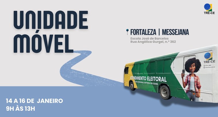 O Tribunal Regional Eleitoral do Ceará (TRE-CE) realiza, nestes dias 14 a 16 de janeiro, das 9h às 13h, atendimento itinerante no bairro Messejana, em Fortaleza. A Unidade Móvel estará estacionada na Escola José de Barcelos, na Rua Angélica Gurgel, n.º 362.