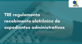 #PraTodosVerem Banner retangular, contendo, em segundo plano, a imagem de duas mãos digitando em um notebook. Na parte central do banner, o título "TRE regulamenta recebimento eletrônico de expedientes administrativos", alinhado à esquerda e na cor branca, e, no canto superior direito, sobre um retângulo branco, a logo do TRE-CE.