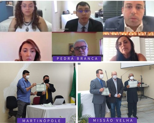 Mosaico com as imagens dos(as) participantes registradas nas solenidades de diplomação das cidades de Martinópole, Missão Velha e Pedra Branca. Na parte superior, print da cerimônia virtual de Pedra Branca. Na imagem, linha superior do print, da esquerda para direita: a chefe de cartório Iara Gabriela, o juiz eleitoral da 59ª ZE, Adriano Ribeiro Furtado, o candidato eleito a prefeito Matheus Pereira Mendes; e, na linha inferior, da esquerda para direita: a promotora eleitoral Karina Mota, o candidato a vice-prefeito eleito Francisco David Alves de Melo e a servidora da 59ª ZE Antônia Pereira. Na parte inferior do mosaico, da esquerda para direita: as fotos registradas nos municípios de Martinópole e de Missão Velha. Na imagem de Martinópole, em pé e atrás de uma mesa com uma toalha branca, o candidato a prefeito eleito Francisco Ediberto de Souza segura o diploma ao lado do juiz eleitoral da 25ª ZE, Francisco Janaílson Pereira Ludugero. Eles usam máscara. Na foto de Missão Velha, em pé, em frente a uma mesa com toalha branca, da direita para esquerda: o candidato a prefeito eleito Luiz Rosemberg Dantas Macedo Filho, o e a vice-prefeito eleitos, o juiz eleitoral da 16ª ZE, Djalma Sobreira Dantas Júnior, e candidato a vice-prefeito eleito Rodrigues Roberto. Os candidatos a prefeito e vice-prefeito eleitos seguram os diplomas.