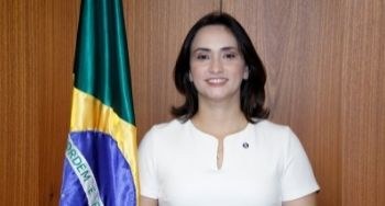 Foto em plano médio da juíza Kamile Castro. Ela está usando uma roupa branca com manga curta. Ela tem cabelos castanhos, partidos ao meio, e sorri. Do lado esquerdo da foto, há uma bandeira do Brasil disposta num mastro. Ao fundo, uma parede revestida com madeira.