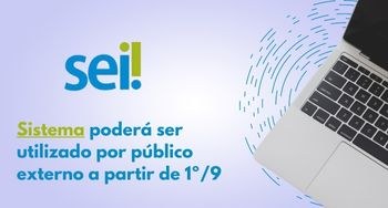 Banner retangular de fundo cinza. Ao lado esquerdo do banner, a logo do SEI. Abaixo, o texto: Sistema poderá será utilizado por público externo a partir de 1º /9. A palavra "sistema" está escrita em letras verdes, e o restante do texto está em letras azuis. No lado direito do banner, sobre um círculo formado por linhas azuis, está a imagem de parte de um notebook aberto.