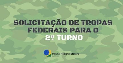 Banner horizontal com fundo camuflado, em estilo militar. Ao centro, Solicitação de Tropas Federais para o 2º turno está em letras cinza. A expressão 2º turno está em letras brancas. Abaixo, logo do Tribunal Regional Eleitoral do Ceará.