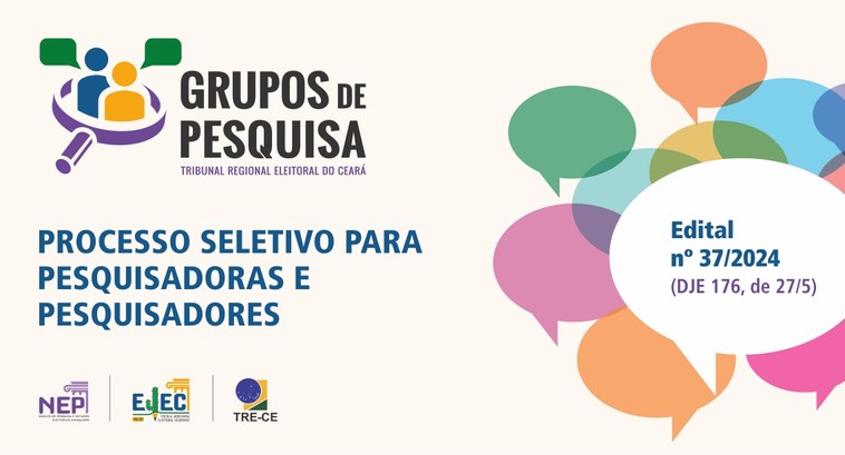 O Tribunal Regional Eleitoral do Ceará (TRE-CE), por meio da Escola Judiciária Eleitoral Cearense (EJEC) e do Núcleo de Pesquisa e Estudos Eleitorais Avançados (NEP), lança o Edital n.º 37/2024, que abre processo seletivo de pesquisadoras e pesquisadores para composição dos Grupos de Pesquisa (GP) deste Tribunal. Com inscrições abertas, interessados(as) devem responder o formulário digital até 9 de junho de 2024.