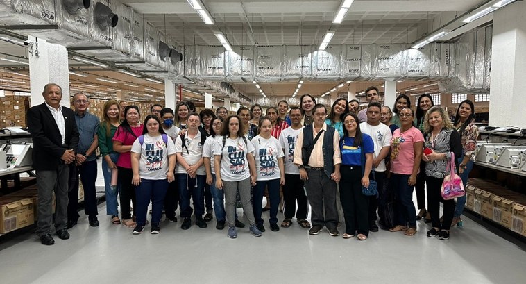 Registro fotográfico na horizontal feito no CAMU (Centro de Armazenamento e Manutenção das Urnas). Estão presentes os participantes do Alistamento Down, além dos servidores do TRE-CE. No cenário, há urnas enfileiradas.