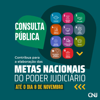 Card gráfico de fundo verde. Na parte de cima, há dois balões lado a lado. Um deles é fundo para o texto: "Consulta pública" e o segundo para ícones que representam as onze metas do Poder Judiciário. Abaixo, as informações: "Contribua para a elaboração das metas nacionais do Poder Judiciário | até o dia 8 de novembro". Há ainda a logo do CNJ.