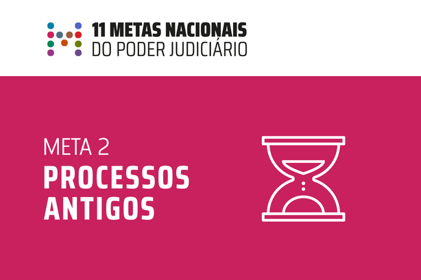 O card gráfico tem fundo rosa e branco. No topo dele, há o título "11 metas do Poder Judiciário". Abaixo, o texto: "Meta 2 - Processos antigos" e uma ampulheta.