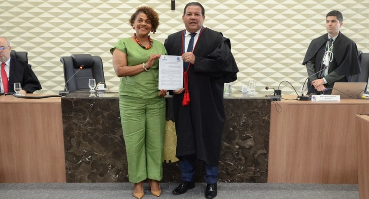 A imagem mostra duas pessoas no centro segurando um documento. À esquerda, uma mulher vestindo roupa verde e colar vermelho sorri para a câmera. À direita, um homem usando uma toga e gravata vermelha também segura o documento. Eles estão em um ambiente formal, com uma mesa de madeira escura ao fundo.