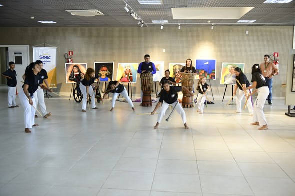 Registros fotográficos feitos durante o evento. No primeiro, à frente de uma bancada de madeira e de um painel bege em 3D, oito pessoas posam para a foto, sendo quatro mulheres e quatro homens, entre autoridades e palestrantes do encontro. No segundo registro, pessoas com calças brancas e blusas pretas fazem movimentos da capoeira, enquanto outras manuseiam instrumentos de som. Atrás deles, há quadros expostos. No terceiro registro, três palestrantes estão sentados atrás de uma bancada de madeira. Ao lado deles, há um quadro de uma mão fechada, com detalhes em degradê amarelo, laranja e vermelho. Na última foto, o grupo Maracatu posa, com roupas e adereços que representam o movimento, como saias cheias, coroas e instrumentos de percussão.