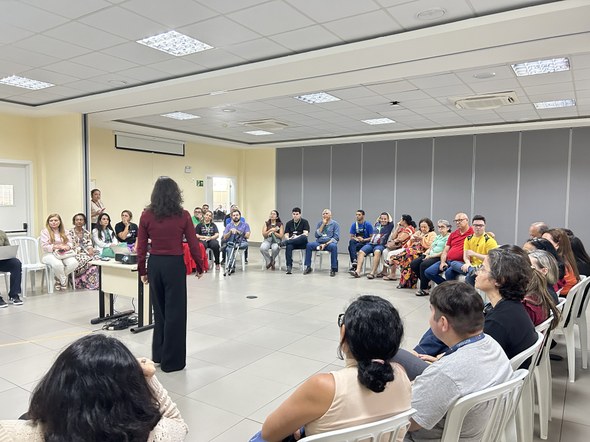 Usando o instrumento kalimba, a juíza interagiu com os(as) participantes, contando a história da menina com espectro. Em sua fala, ela descreve sobre a inclusão de pessoas neurodivergentes e o direito ao seu pleno desenvolvimento em comunidade. “Antes, as pessoas com deficiência eram tiradas do convívio social, mas essa realidade está mudando”, disse. A magistrada falou ainda sobre acessibilidade; combate ao bullying e o direito à saúde, educação e política.