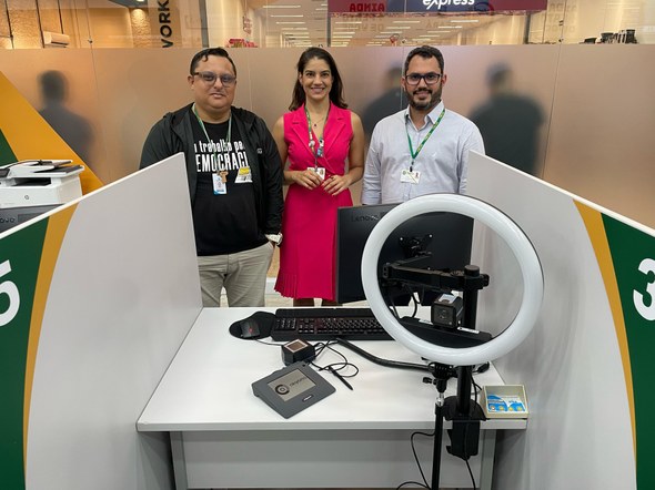 Registros fotográficos feitos no local de atendimento. No primeiro, um colaborador do TRE-CE está orientando uma cidadã no cadastro de digital da Justiça Eleitoral. Ao redor deles, há uma cabine formada por paredes cinzas, com detalhes em verde e amarelo. No segundo, três representantes do TRE-CE, sendo dois homens e uma mulher estão posando à frente da cabine de atendimento.
