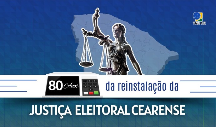 A primeira imagem é um card gráfico de fundo azul com degradê de tons. Ao centro, há o mapa do Ceará e uma estátua da deusa da Justiça, que tem os olhos vendados e segura uma balança. Abaixo, há uma ilustração de urna eletrônica, com o texto no visor: "80 anos" e, ao lado, fora da urna, o complemento: "da reinstalação da Justiça Eleitoral cearense". Há ainda a logo do TRE-CE. A partir da segunda imagem, são registros da história do TRE-CE. A primeira e a segunda fotos são perfis dos desembargadores Faustino de Albuquerque e Sousa e Daniel Augusto Lopes em preto e branco. Na terceira e na quarta, registros de prédios antigos, nos quais funcionaram a Justiça Eleitoral cearense anteriormente. Na última foto, um título de eleitor, com dados de uma cidadã, como nome completo, estado civil, nomes dos pais, zona e circunscrição em que se alistou.