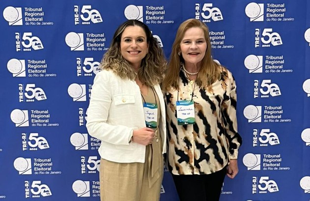Foto colorida em formato retangular. No registro, estão as duas representantes do TRE-CE em pé, posando para a foto. Atrás, está um banner na cor azul com informações sobre o evento.