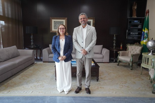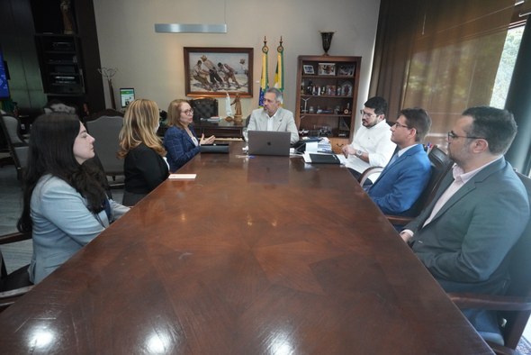 Registros fotográficos feitos durante a reunião. No primeiro, a presidente do Tribunal e o governador do Estado posam para a foto, em uma sala com paredes em tom marrom escuro. Ao fundo, há quadros decorativos pendurados na parede, sofás na cor bege, uma mesa de centro de madeira e um tapete branco que cobre parte do piso. No segundo, os participantes do encontro estão sentados em torno de uma mesa de madeira.