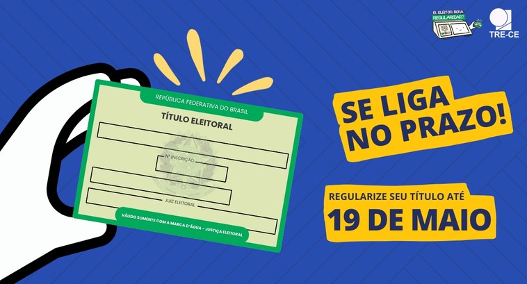 Card gráfico de fundo azul, com detalhes em linhas pretas. Nele, há os textos, sobre um fundo de destaque amarelo: "Se liga no prazo | Regularize o título até 19 de maio". Há ainda a ilustração de uma mão segurando um título de eleitor, documento de cor verde, e logos da campanha de regularização e do TRE-CE.