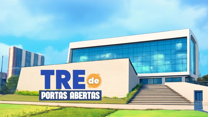 Card gráfico que tem, ao fundo, uma ilustração da sede do TRE-CE. Sobre ela, o texto: "TRE de Portas Abertas".