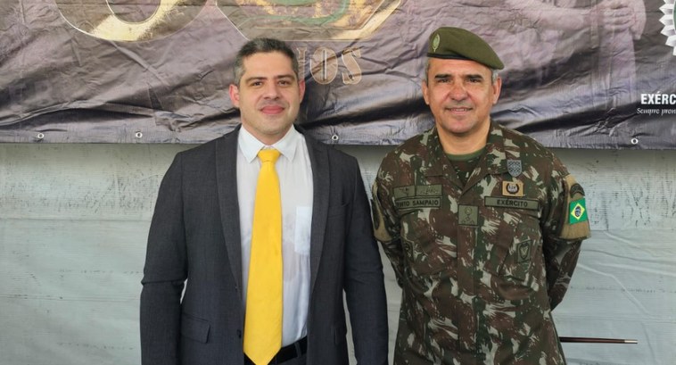 No registro fotográfico, há dois homens posando para a foto. Ao lado esquerdo, o juiz do TRE-CE usa terno cinza, blusa branca e gravata amarela, e ao lado direito, o comandante da 10° Região Militar, usando uniforme militar.