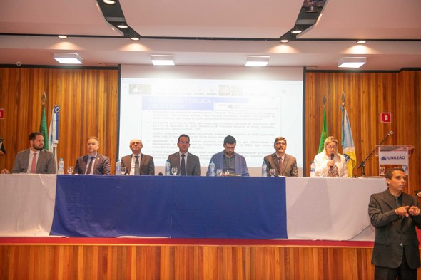 Registros fotográficos feitos durante a audiência pública. No primeiro, de ângulo lateral, sete pessoas estão sentadas diante de uma mesa com toalhas brancas e azuis. Uma delas é uma mulher, que segura o microfone. Atrás deles, há uma tela de projeção. No segundo registro, a cena é a mesma, mas o ângulo é frontal.