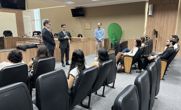 Representando a presidente do Regional cearense, desembargadora Maria Iraneide, o juiz auxiliar Alisson Simeão recepcionou os(as) visitantes no Pleno do Tribunal. Na ocasião, o magistrado apresentou o funcionamento da Justiça Eleitoral, a estrutura do TRE-CE e aspectos do Direito Eleitoral, além de esclarecer dúvidas dos(as) estudantes.